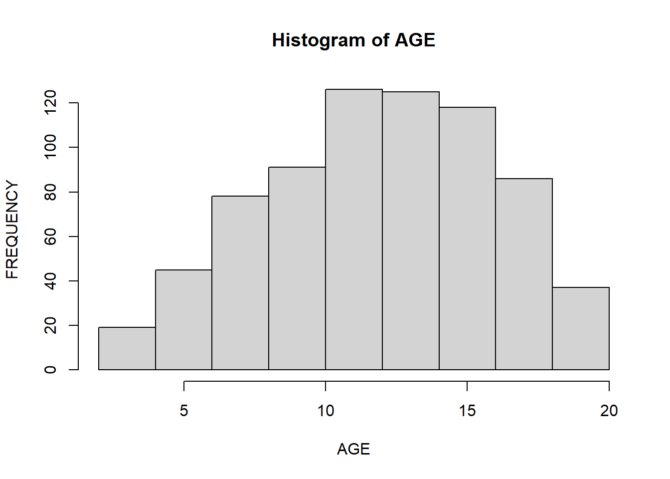 Histograms display a distribution of numerical data. They represent the frequencies of values of a variable bucketed into ranges. The function hist() is used to plot histograms. Let’s plot a histogram of the Age variable: