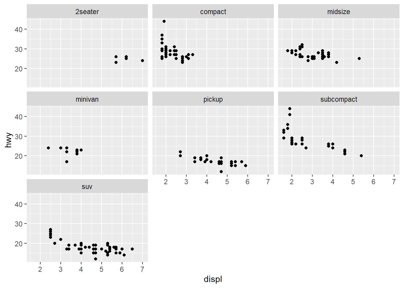 To facet your plot by a single variable, use the facet_wrap() function. The first argument of facet_wrap() should be a formula, which you create with ~ followed by a variable name (here “formula” is the name of a data structure in R, not a synonym for “equation”). The variable that you pass to facet_wrap() should be discrete. Let’s plot displ against hwy for each level of the class variable separately: