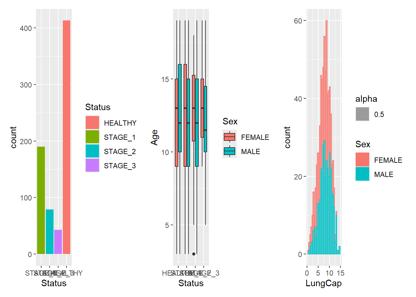 As mentioned in Lecture 08, barplots refer to a graph where the bars represent the count of cases in each category of a categorical variable. This is similar to a histogram, but with a discrete instead of continuous x-axis. To generate a barplot with ggplot2 package, add another layer to a ggplot object using the geom_bar() function. Here we have a dataset1 dataset (lungcapacity data) and we want to generate a barplot for the Status variable, which is a categorical variable with 4 levels (categories):